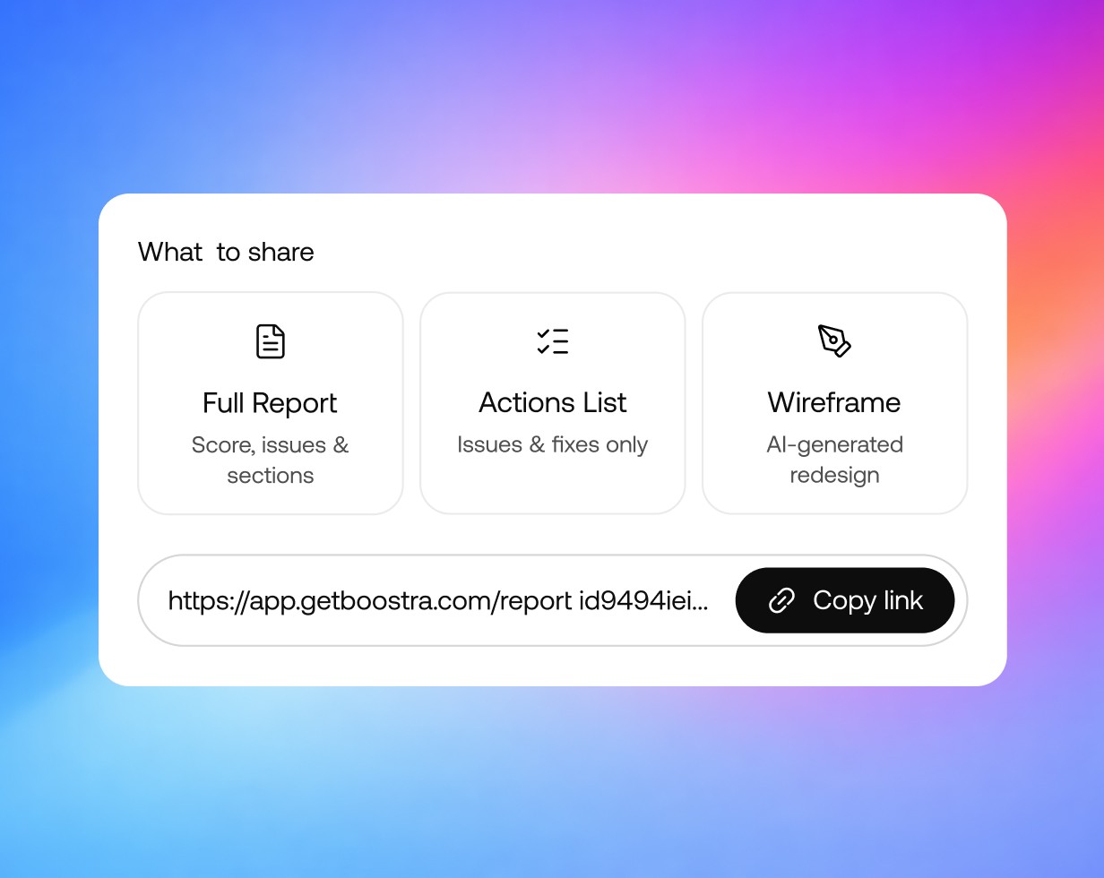 We now run every new page through Boostra before launch. It catches UX issues, accessibility gaps, and conversion leaks in minutes, not weeks.